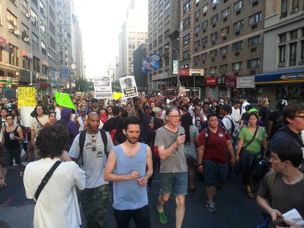Protests are taking place in cities across the U.S., and one of the larger protests is happening in New York City's Times Square. Thousands have taken to the streets to protest the verdict, shouting "No justice" and "Trayvon."