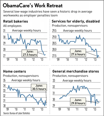 After all, 1.4 million workers could lose an 8-hour shift and it would shave just six minutes off the average workweek. But if one looks closely, it's not hard to find industry groups with an unprecedented drop in work hours since ObamaCare became law.