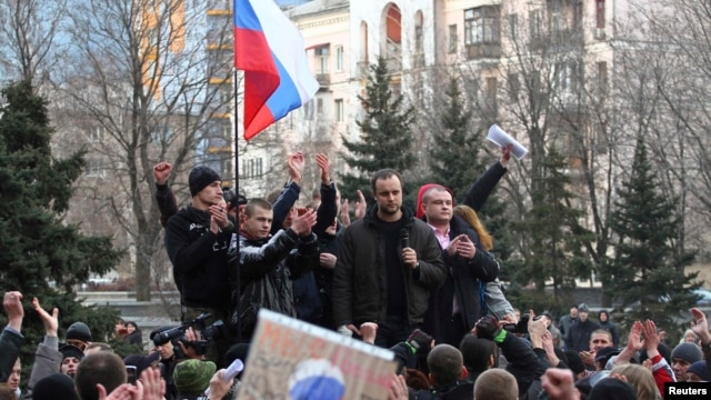 Pro-Russian demonstrators take part in a rally in front of the regional government building in Donetsk on March 5.