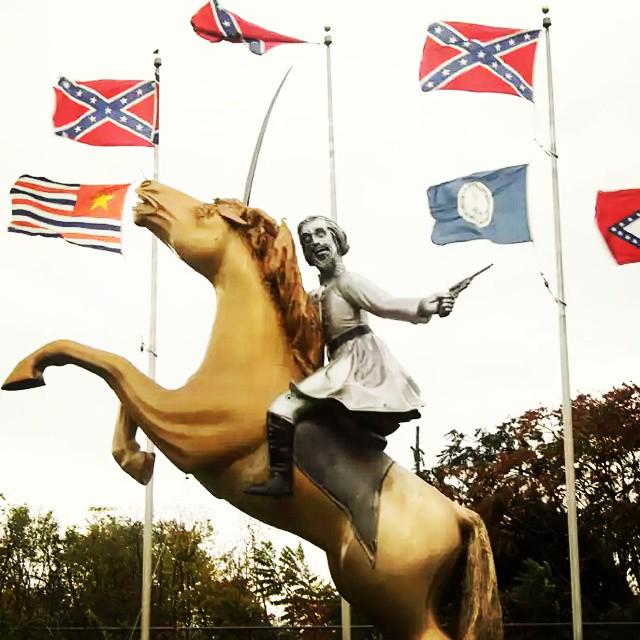 It’s private property. Besides, it looks like a merry-go-round ride horse. He could at least put up a better statue and he NEVER changes the flags. They get all frayed.