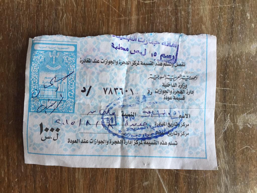 Syrian gov. receipt for deposit for Syrians to leave the country, Note!...'refunded on return'...