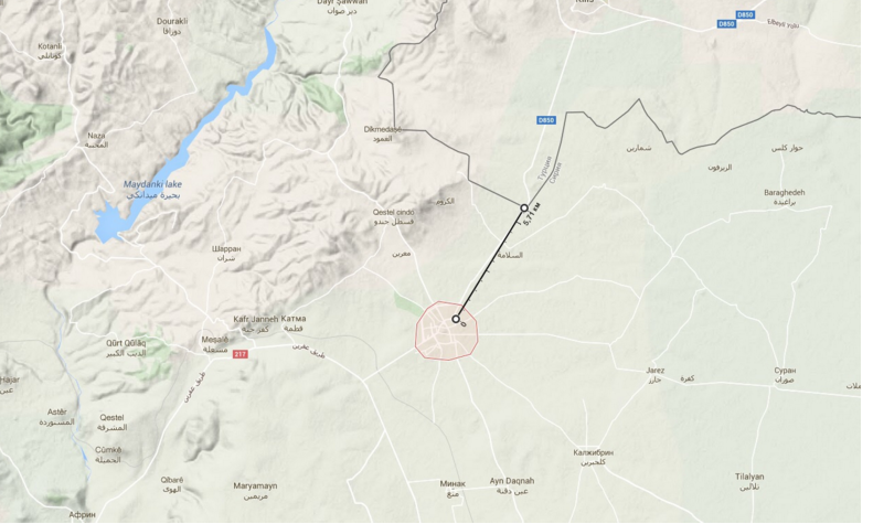 As you can see, it's about five km from the Turkish border. Speaking of buffer zones, Turkey was expecting to make this city an absolute springboard, out of reach of Syrian army strikes. It did not happen. But until today, due to the remoteness of the Syrian army from it, as well as a number of geopolitical reasons, attacks were not mounted on this city.