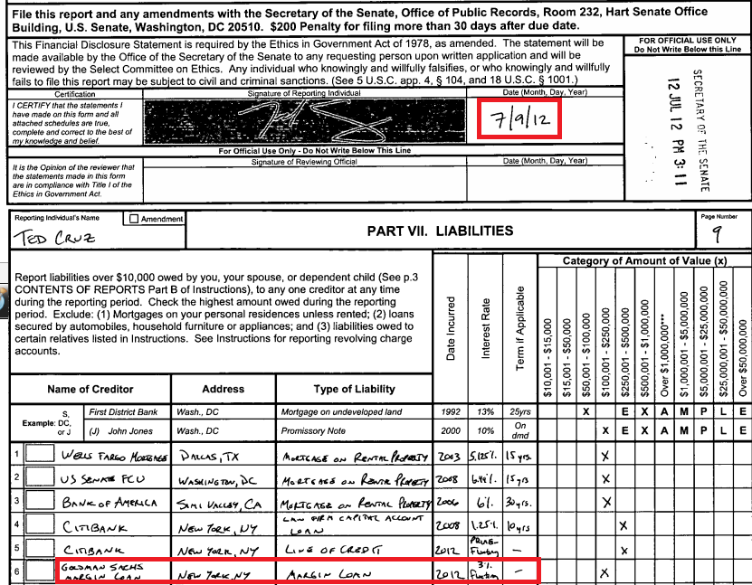 As of the end of 2012, Cruz listed a "Loan to Ted Cruz For Senate" as an asset valued at$500,001 to $1 million. However, because of the 2002 changes to campaign finance law, the committee is limited to making loan repayments to the candidate (1) from funds received before an election, or (2) $250,000 from funds received after an election. Because of earlier loan repayments, as of the end of 2012, the committee could only legally repay the candidate $298,000. This includes $48,000 for his outstanding primary election loans, and $250,000 for his outstanding runoff election loans. … Cruz does list on his personal financial disclosure report as liabilities two loans received in 2012. One was a margin loan of $250,001 to $500,000 from Goldman Sachs. The other was a line of credit of $250,001 to $500,000 obtained from Citibank.