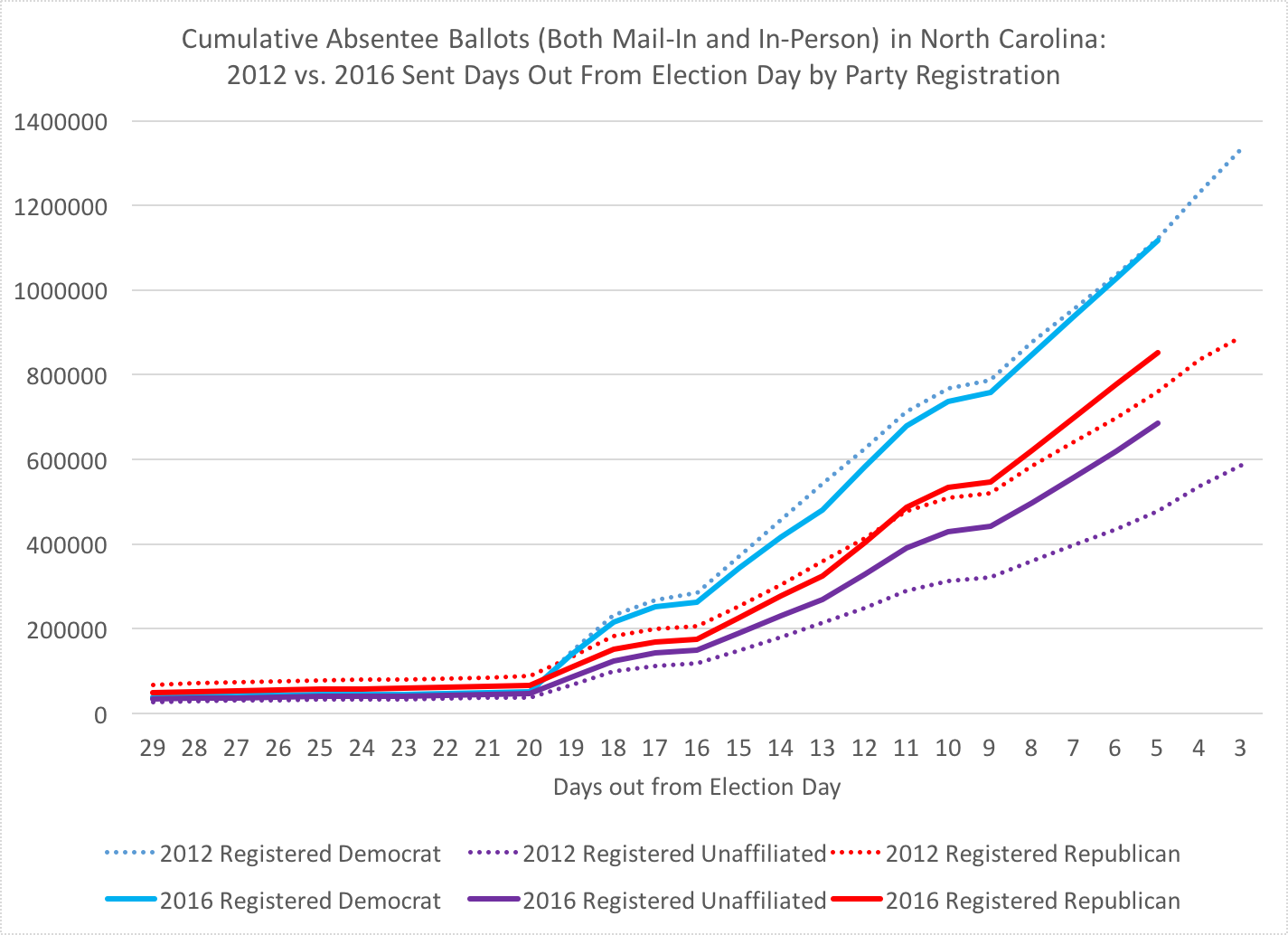 Based on ONSP site, for total early voting, I’m estimating Rep pick up ~150k vs 2012 (~180k in person - 33k mail in). Dems up ~5k (+5-10k in person - 3k mail in). Unaffiliated up 260k. Ignoring unaffiliated, that’s another net 2.5% pick up for Trump on a state Romney won by 2%. Unaffiliated are heavy white (79%) so I’m optimistic Trump may have picked up 3% or so vs 2012 in early voting compared to Romney. I think Trump wins NC by 4-6%.