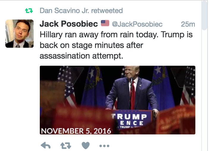Donald Trump resumed his rally today minutes after an potential assassination attempt...hillary cancelled her after seven minutes of rain...
