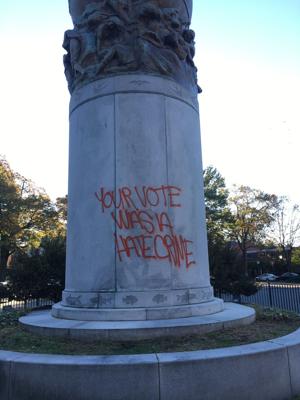Graffiti on the side of a statue of Confederate President Jefferson Davis said, Your vote was a hate crime. Also tagged were statues of Confederate General Robert E. Lee and naval officer and oceanographer Matthew Fontaine Maury.