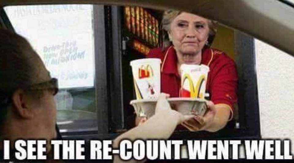 "And as the election boards re-confirm her crushing, humiliating defeat at the hands of HAHAHAHAHAHAHAHAHA! Donald Freaking Trump, sore loser Hillary is now out wandering around hiking trails and Whole Foods stores snapping selfies with teary-eyed dorks and dreaming of running again in 2020."