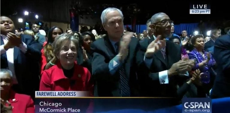 He resigned before the election. He resigned and claimed that he could not continue, he apologized and there he is in the front row of the Obama farewell address last night giving standing ovation after standing ovation, and all Obama It was pathetic, this speech last night. It was one lie after another about all the great things that have happened. The great economy, the great job creation. More job creation in the last eight years than any time in American history. Just full of delusional BS.