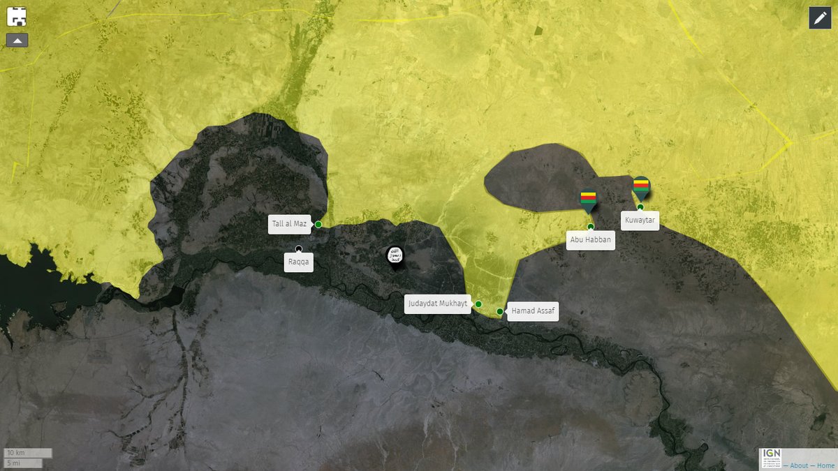 Rumors on twitter are now saying that the Kurds have cut the main road East from Raqqa to Deir ez Zour (which I anticipated). If true, Raqqa would be cut off from vehicle traffic, since the bridges are now down. There is a long urban strip along the river between that cut in the road and the city, which would take a lot of effort to clear, if ISIS fights for it.