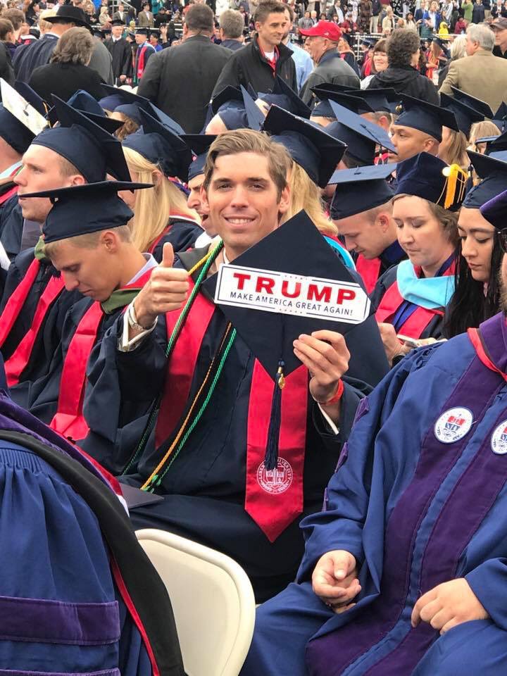 Trump remarks: "I was here a year ago as a candidate, and you were here not yet graduates. To be here today, we both received help from God." Trump now thanking parents and grandparents. Special thanks to moms!