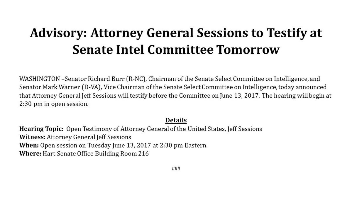 Ryan J. ReillyVerified account @ryanjreilly AG Jeff Sessions has requested his appearance before Senate Intel Committee tomorrow be public, per DOJ.