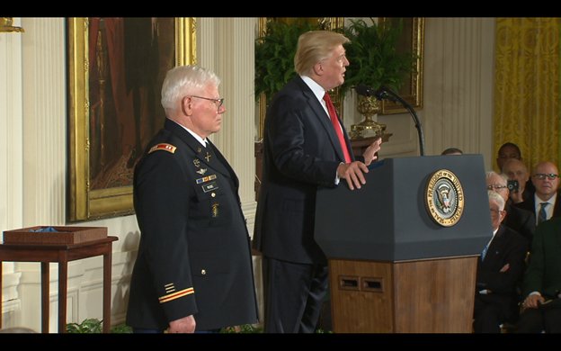 Capt Rose listens as Pres Trump tells the incredible story of Mikes heroic deeds."