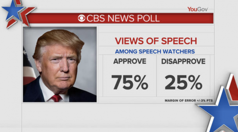 DICKERSON: A CBS News poll shows three-out-of-four Americans who saw the speech approve of the presidents message. Eight-in-ten Americans who watched say they believe Mr. Trump was trying to unite the country rather than divide it. The audience, according to our poll, was 42% Republican, and 25% Democrat.