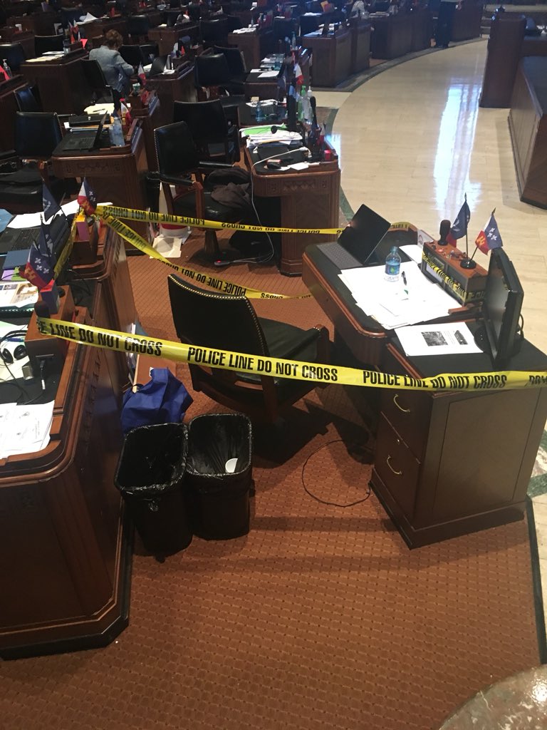 Rep. Bishop got in a bar fight with Sen. Chabert in downtown Baton Rouge last night. This is what his colleagues did to his desk. #lalege #lagov