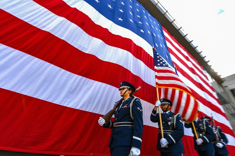 The High Frontier Honor Guard performs during the 50th Network Operations Group change of command ceremony at Schriever Air Force Base, Colo., June 29, 2018. During the ceremony, Col. Hewett Wells assumed command of the group from outgoing commander, Col. W. Scott Angerman. (U.S. Air Force photo by Dennis Rogers)