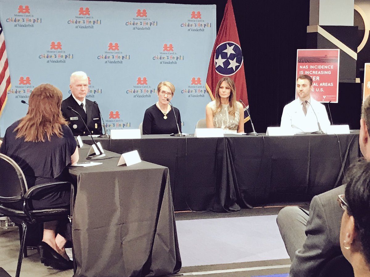 (below) FLOTUS in Nashville listening to doctors, nurses and hospital staff at (Vanderbilt) VUMCchildren all of whom focus on babies and mothers facing neonatal abstinence syndrome (NAS), a little-discussed component of the opioid crisis. Also she checks out 4-year-old Essences manicure. Then Essence takes Melanias fingertips and looks at her manicure and says, Oh! You painted yours white! (7/24/18)