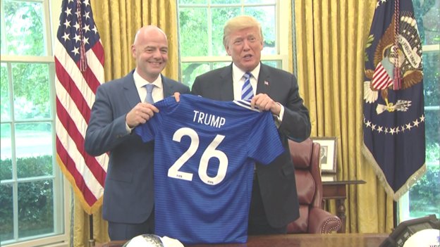 Soccer balls on the Resolute Desk as Pres Trump met this afternoon with FIFA Pres. Gianni Infantino. Trumpeting US, Canada and Mexico hosting the World Cup in 2026, @POTUS joked maybe they'll extend his term in office to attend as pres..(8/28/18)