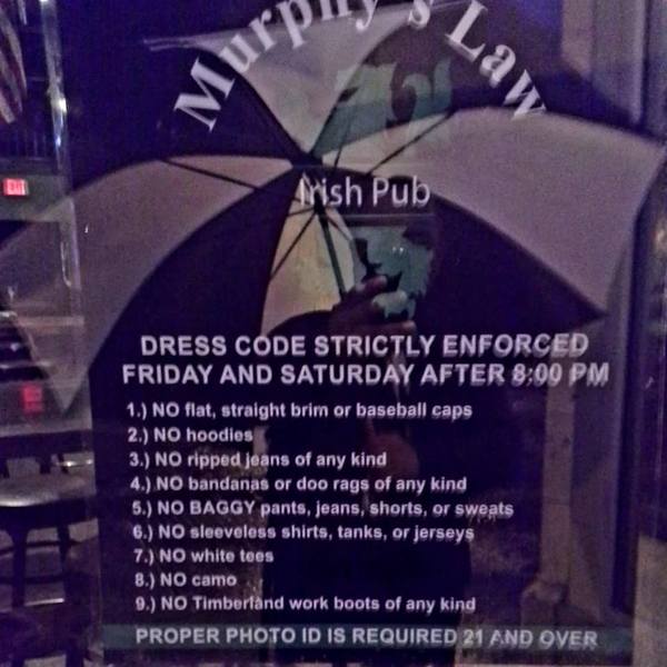 While making plans with a friend to meet up at a nearby bar, Smith received a picture of the questionable dress code posted in the front window of Murphys Law. He tells Yahoo Lifestyle that it immediately struck a chord. Although he wasnt entirely sure what to think about it, he decided to call attention to it.