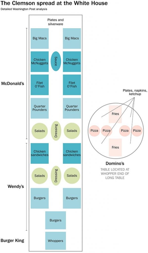 And they have a picture here of the spread. You probably have seen the photo of the spread on the gigantic table in the state dining room, and there is a sound bite. Let me see. Trump made a joke about this, and the Drive-By Media is Oh. Oh. Oh. Here it is. Here it is. Grab Lets see. Grab sound bite Nos. 9 and 10. This is just It fits perfectly. Up first is the president himself last night after welcoming the Clemson football team to the White House, a portion of his welcoming remarks