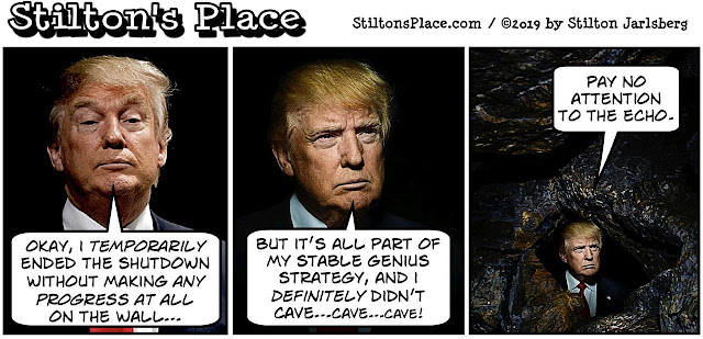 Okay, before anyone gets too wildly bent out of shape by the cartoon above, let us admit that we're only reporting on appearances here - and in the Wild World O' Trump, appearances can be deceiving. We honestly don't know if Donald Trump's temporary end of the government shutdown is a cave or a Burmese tiger trap with sharpened punji sticks waiting to impale overly cocky Democrats (and yes, we're looking at you, Chuck Schumer).