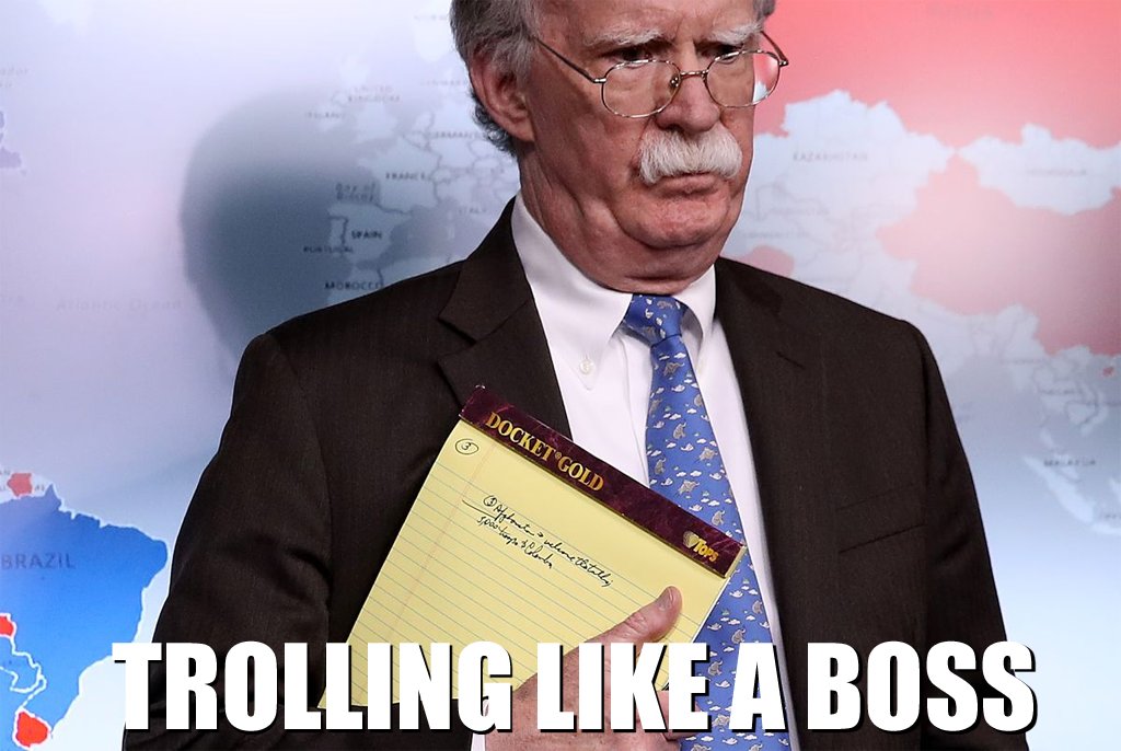 And if Bolton fully intended to let the press capture his note on camera, he did a fine job of it. A beautiful piece of diplomatic poker. That's what I'm betting it was.