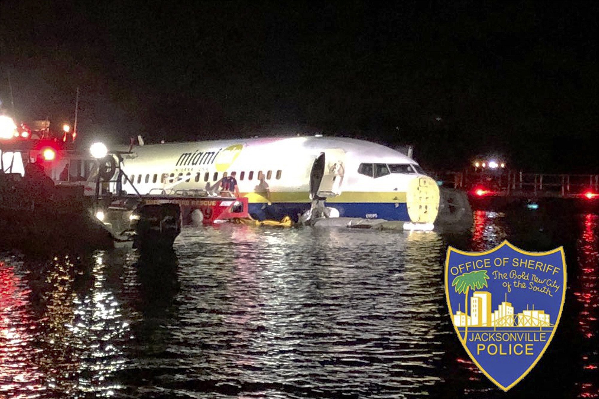 Base Commander Captain Mike Connor, Commanding Officer NAS Jacksonville, speaks about a plane crash on Friday at a news briefing near the front gate of Naval Air Station (NAS) in Jacksonville, Fla., early Saturday, May 4, 2019. A charter plane with multiple passengers traveling from Cuba to north Florida ended up in a river at the end of a runway Friday night, though no critical injuries or deaths were reported, officials said. (AP Photo/Gary McCullough) In this photo released by the Jacksonville Sheriff's Office, authorities work at the scene of a plane in the water in Jacksonville, Fla., Friday, May 3, 2019. Officials say a charter plane traveling from Cuba to north Florida ended up in a river at the end of a runway. A Naval Air Station Jacksonville news release says a Boeing 737 arriving from Naval Station Guantanamo Bay, Cuba, crashed into the St. Johns River Friday night.