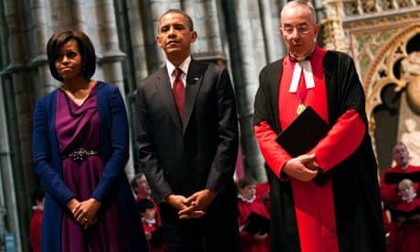 Barack and Michelle Obama attend a wreath-laying ceremony with Reverend Dr John Hall at Westminster Abbey.