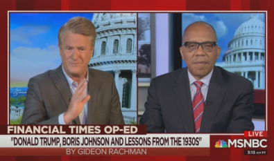 Then came Tuesday morning, when Morning Joe made the Trump/Nazi analogy explicit. First, Mika Brzezinski read portions of a column [subscription required] in the Financial Times in which British author Gideon Rachman [who twice endorsed Obama] drew an analogy between Germany in the early 1930s and the US/UK, now with the advent of Boris Johnson as Prime Minister.