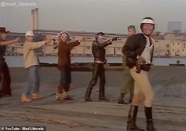 In the parody by the fake band The American People, the faces of the original singers dressed to look like a motorcycle cop, an Indian Chief, a cowboy, a construction worker, a biker and a GI are replaced with the faces of Trump as the front man and democratic presidential candidates Bernie Sanders, Joe Biden, Cory Booker as backup singers.