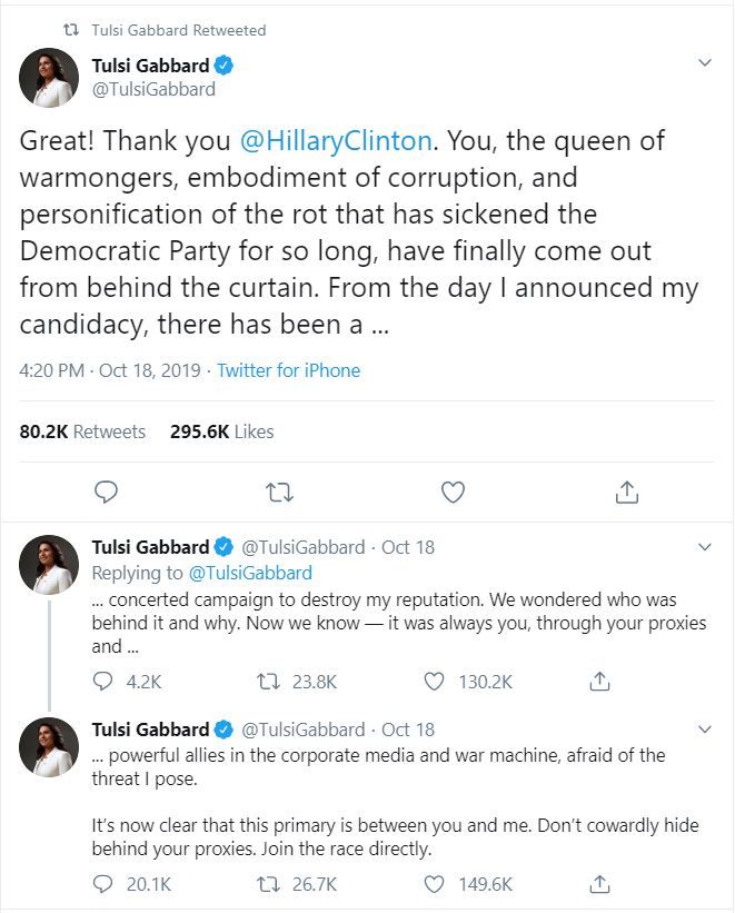 On Friday, Oct. 18, Gabbard responded on Twitter, "Thank you @HillaryClinton. You, the queen of warmongers, embodiment of corruption, and personification of the rot that has sickened the Democratic Party for so long, have finally come out from behind the curtain."