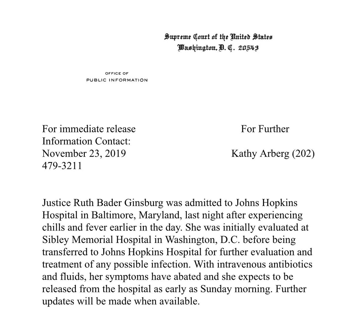 I see now. The Supreme Court, not the hospital, is saying the Justice Ginsburg “expects to be released from the hospital as early as Sunday morning.”