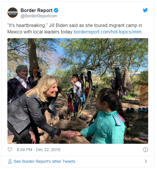 Former second lady Dr. Jill Biden, whose husband former VP Joe Biden is running for the 2020 Democrat nomination, handed out tamales and Christmas gifts to migrants in Mexico as part of a visit with local leaders on Sunday -- and many Americans were not pleased with her choice of venue.