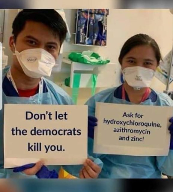 A photo shared widely on Facebook claims to show two healthcare workers holding signs that say Dont let the Democrats kill you and Ask for hydroxychloroquine, azithromycin and zinc! (here, here ). This image is photoshopped.