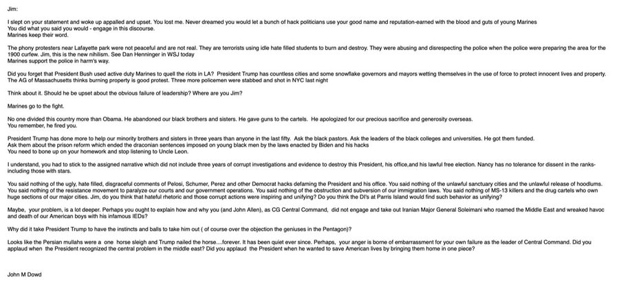 This letter is Spot On. Every word true. John Kelly has piped up as well in support of Mattis. Prior to this letter. Perhaps he wishes he had kept his mouth shut.