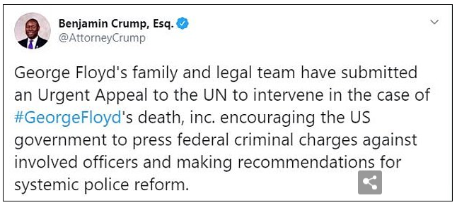 The lawyer representing the family of George Floyd has urged the United Nations to intervene in the investigation of the black man's police-related slaying.