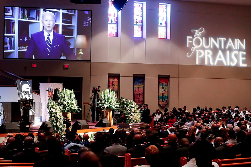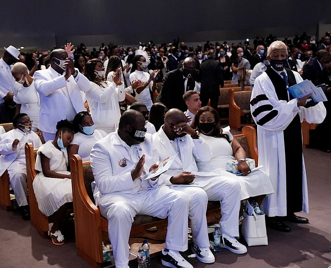 A pastor at George Floyd's funeral called for the White House to be 'cleaned out' and urged the public to vote as hundreds of mourners, including the families of Ahmaud Arbery, Botham Jean and Eric Garner, gathered to lay the beloved father to rest.