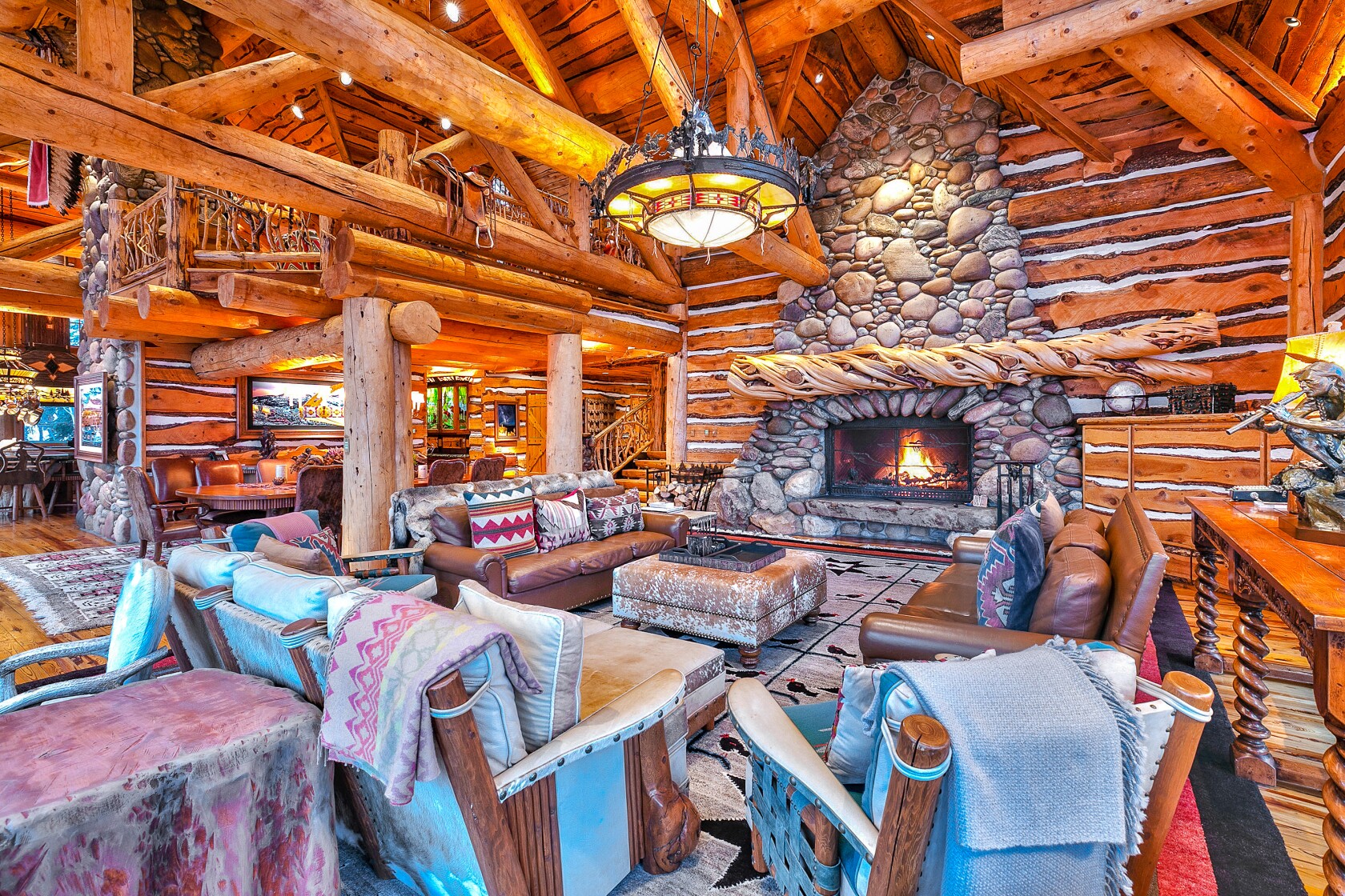 The snowy retreat centers on a log cabin-style mansion of more than 12,000 square feet. Across four stories sprawling down the hillside, it holds six bedrooms, nine bathrooms and dramatic living spaces full of wood, stone and glass.
