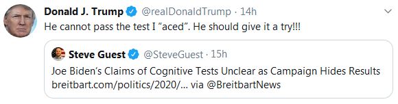 The president has challenged presumptive Democrat nominee Joe Biden to take a cognitive test. On Thursday, he claimed Biden could not pass the cognitive test that President Trump claimed he aced.