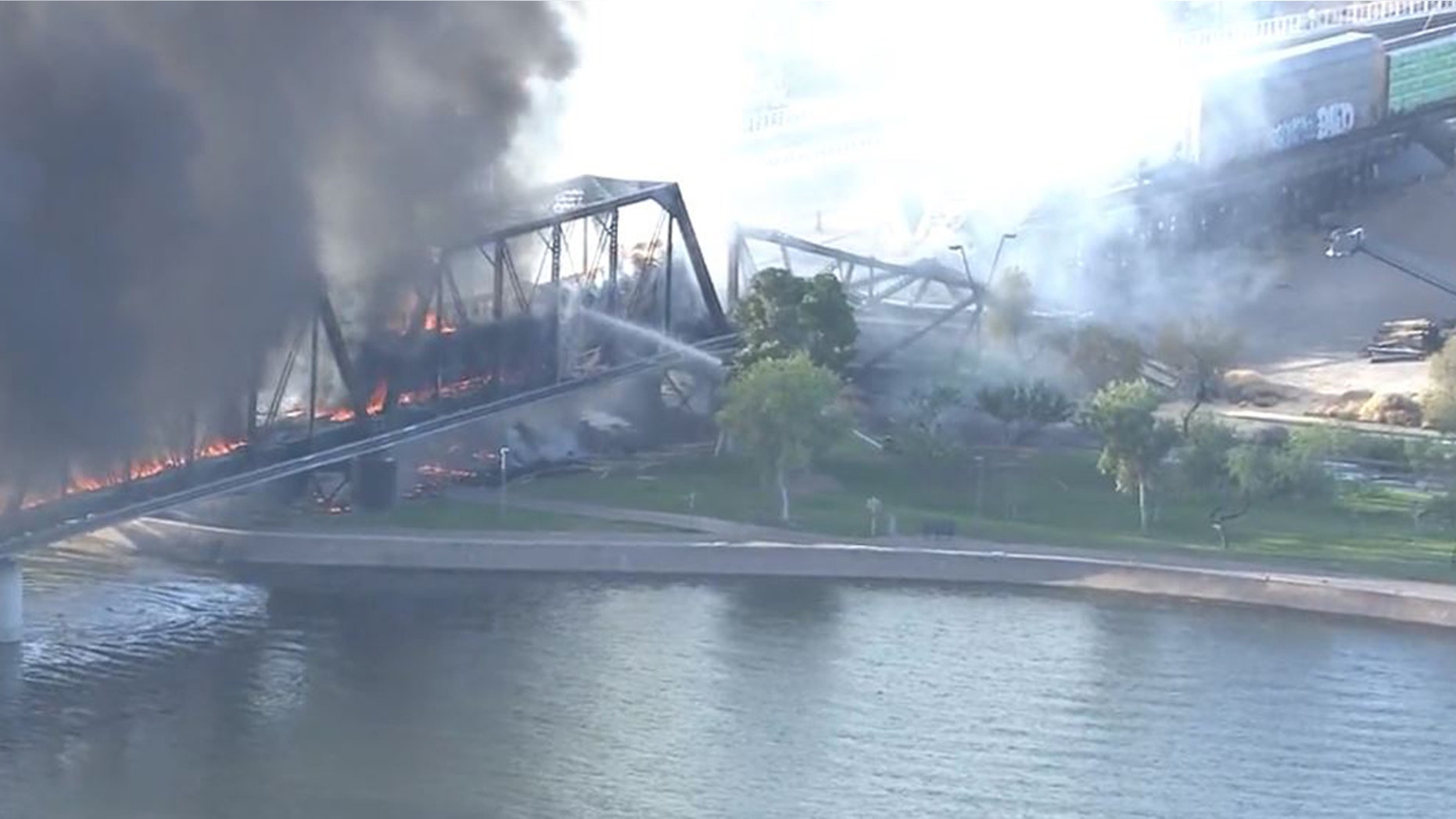 A bridge over a lake in Arizona partially collapsed on Wednesday after a freight train derailed and caught fire.