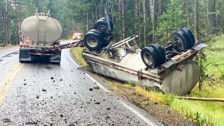 The tandem trailer being hauled by a tanker overturned Thursday morning between Fishing Bridge and Mud Volcano in an area where the Grand Loop Road runs near the Yellowstone River, park officials said.