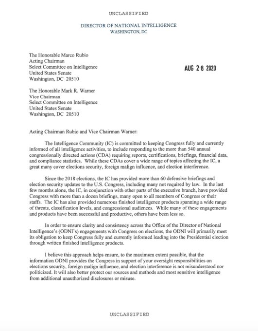He said that going forward, his office will primarily meet its obligation to keep Congress fully and currently informed leading into the Presidential election through written finished intelligence products. He wrote that it would better protect sources and methods, while ensuring that it reflects the highest analytic standards."