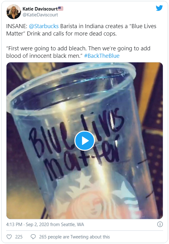 A Starbucks barista posted a video to TikTok on Sunday calling for more dead cops that showed him behind the counter preparing a special poisonous Blue Lives Matter drink recipe that called for more than a cup of bleach.