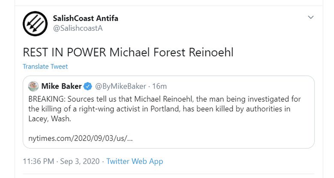 It was reported that on Antifa message boards Reinoehls death was being called a police execution.