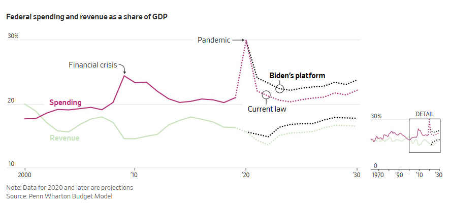 Mr. Bidens proposed budget is more than double that of Hillary Clinton, the 2016 Democratic nominee. It is a fraction of the $30 trillion to $50 trillion spending plans that progressive Sens. Bernie Sanders and Elizabeth Warren laid out during the Democratic primary. But since effectively sealing the nomination in March, Mr. Bidens plan has grown in response to the pandemic, the lockdowns, and the resulting recession.