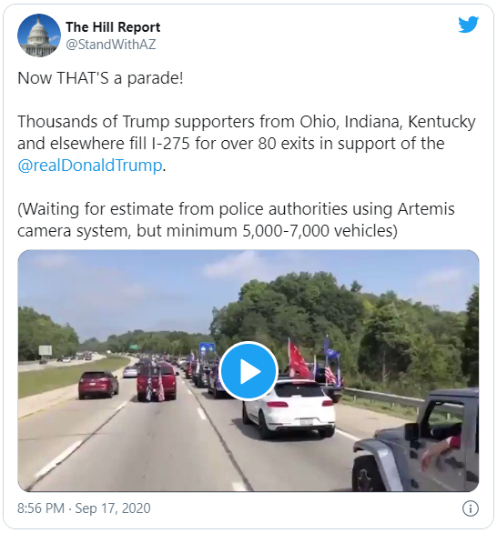 I was in that parade. Even though a little over 7000 people signed up as going on Facebook, police estimate up to 20,000 cars. That was my guess as well. It is an 80+ mile loop and I was in traffic from 10:45-1:30 and there wasn’t a minute I was on the road where there weren’t Trump/American/Pro-police flags. It was a beautiful thing.