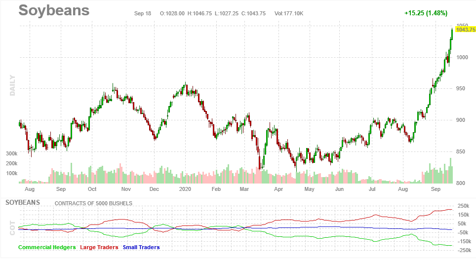 Most-active soybean futures trading on the Chicago Board of Trade closed Friday at over $10.43 per bushel, their highest level since May 2018. Soybean prices have risen more than 16% since the start of August.