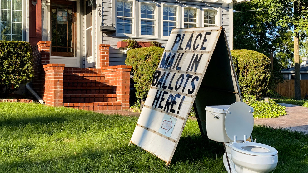 A Michigan prosecutor will not pursue felony charges over a homeowner who displayed a toilet with a sign reading Place mail in ballots here.