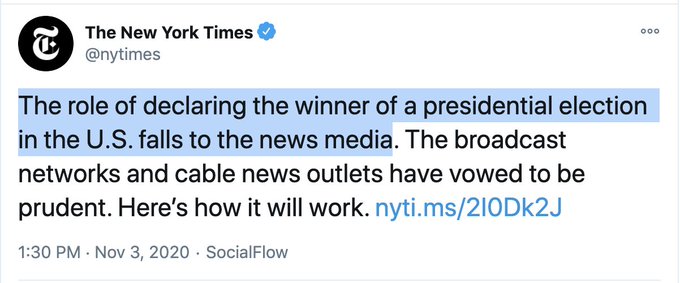 I had the same thought. Last i heard, it was the secretary of state for each state that declared the winner in that state by certifying the results. Then the electoral college does its duty. I’m astonished that the media has any part in this at all. Its not what i was taught.