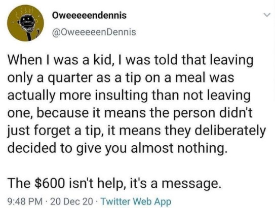 "It is the day after Christmas, and millions of families don't know if they'll be able to make ends meet because of President Donald Trump's refusal to sign an economic relief bill... Gee, and here I thought it was because of all those Dem Guvs shutting down their states, closing businesses and throwing workers out on the street...