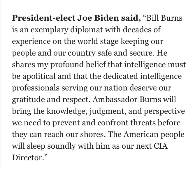"Bill Burns is an exemplary diplomat with decades of experience on the world stage keeping our people and our country safe and secure," Biden said in a statement. "He shares my profound belief that intelligence must be apolitical and that the dedicated intelligence professionals serving our nation deserve our gratitude and respect. Ambassador Burns will bring the knowledge, judgment, and perspective we need to prevent and confront threats before they can reach our shores. The American people will sleep soundly with him as our next CIA Director.”